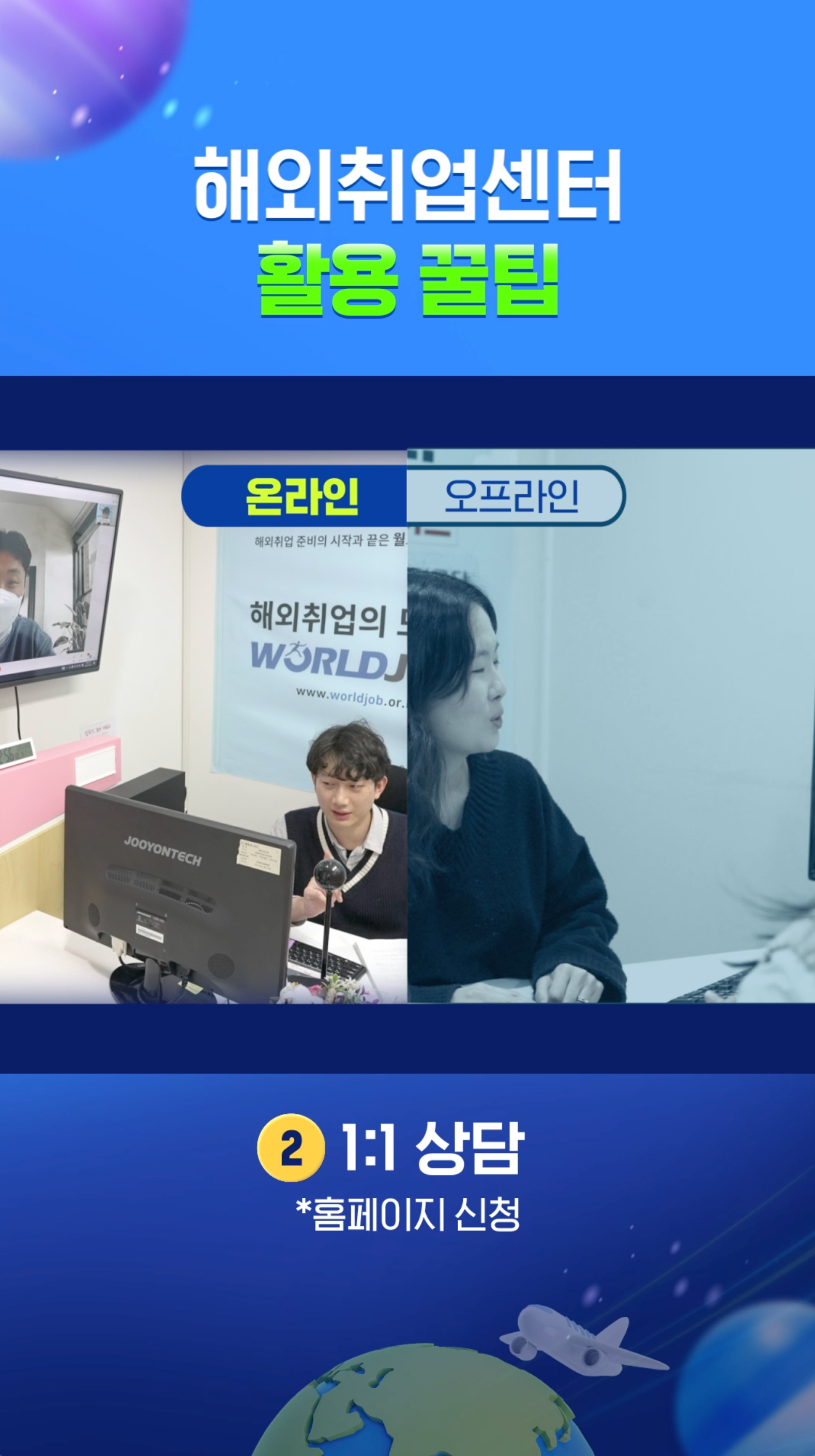 월드잡플러스 유튜브 채널에 올라가는 기본 채널용 영상과 숏츠 버전 영상입니다. 해외취업센터 소개내용을 담고 있습니다.